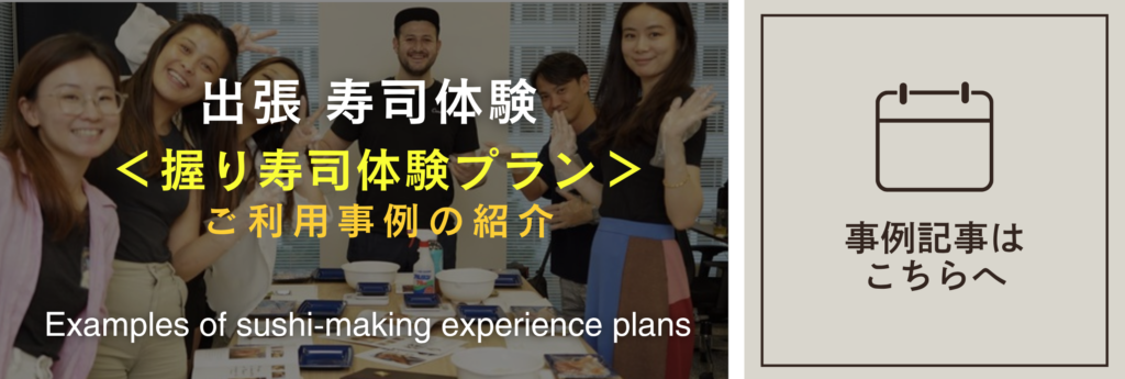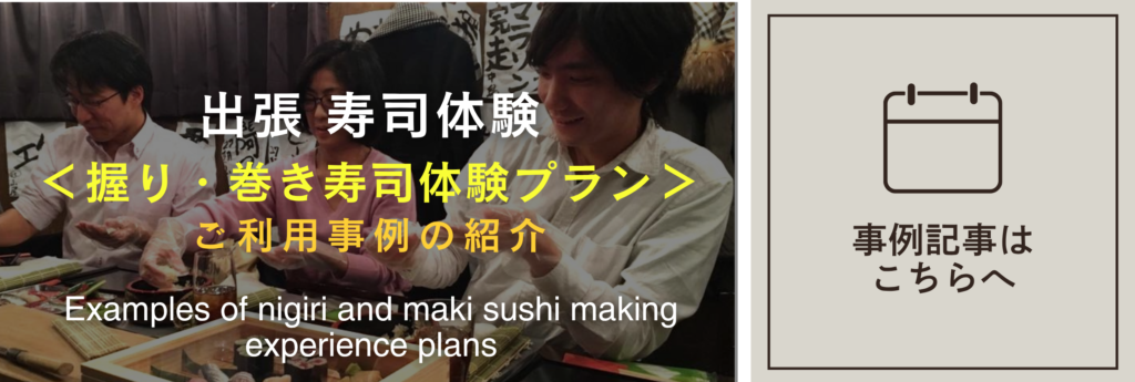 | ●ご要望の場所に寿司職人が出張し、寿司体験を行っていただける教室(ワークショップ)です。 ●英語版のマニュアルもありますので、外国のお客様にも楽しく、寿司体験に挑戦していただけます。 ●企業の社内イベントやインバウンド向けのイベント、特別なお客様を招待したイベントやマンションイベントなど、幅広い機会で、出張 寿司握り体験教室は、想い出深い体験を行っていただけます。 | ||||